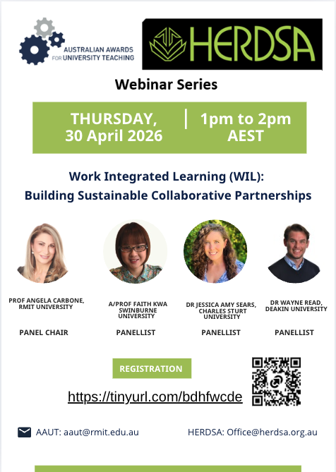 This panel is the first session in the 2026 AAUT & HERDSA National Webinar Series, which celebrates and amplifies the outstanding contributions of the 2024 Australian Awards for University Teaching (AAUT) recipients. The series showcases innovative and impactful teaching practices across the Australian higher education sector and provides a platform for award recipients to share insights, strategies, and outcomes from their award-winning work.